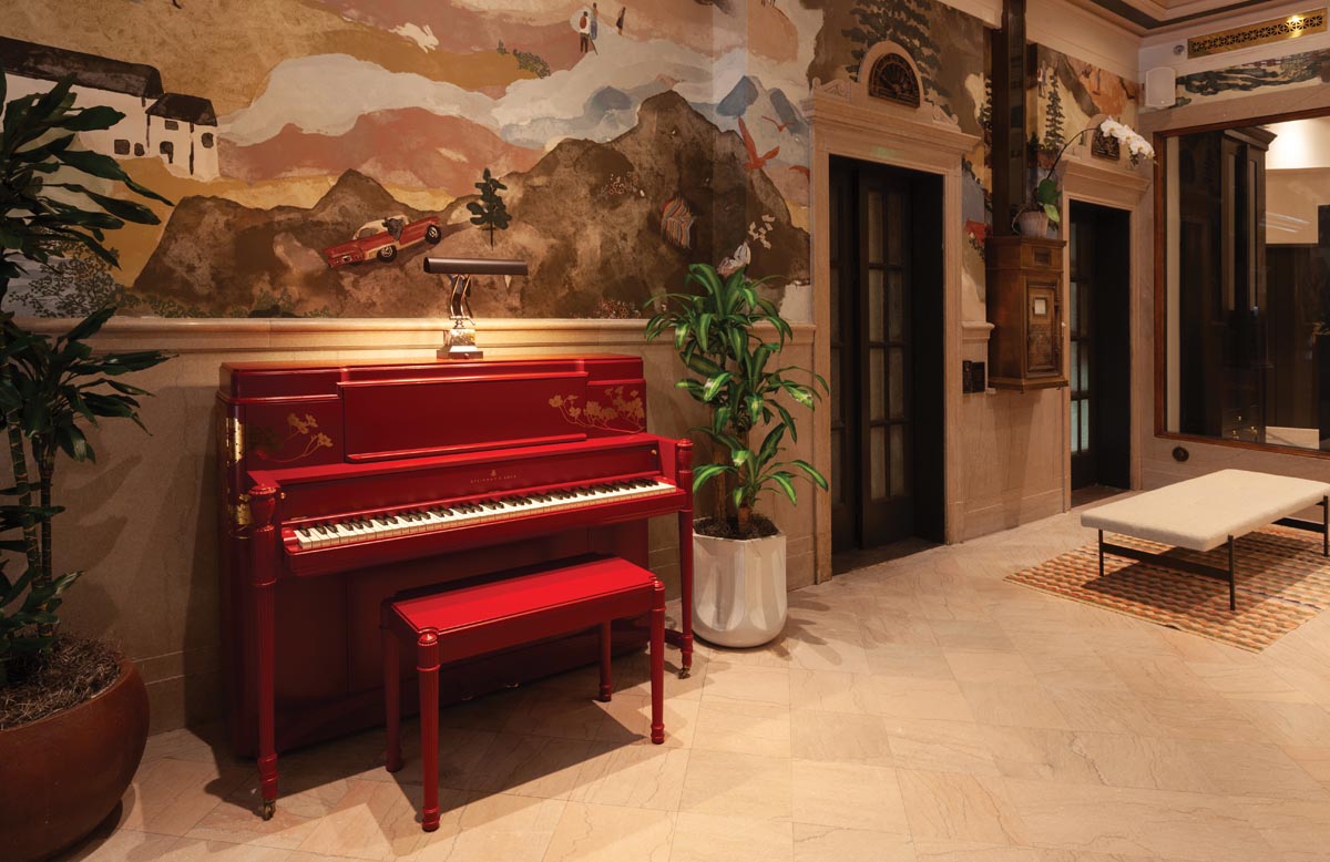 Locally commissioned art and handmade details juxtapose Appalachian craftsmanship with Art Deco elegance — from murals of bluegrass bands to paintings of clouds to a cowhide mosaic honoring WWNC.