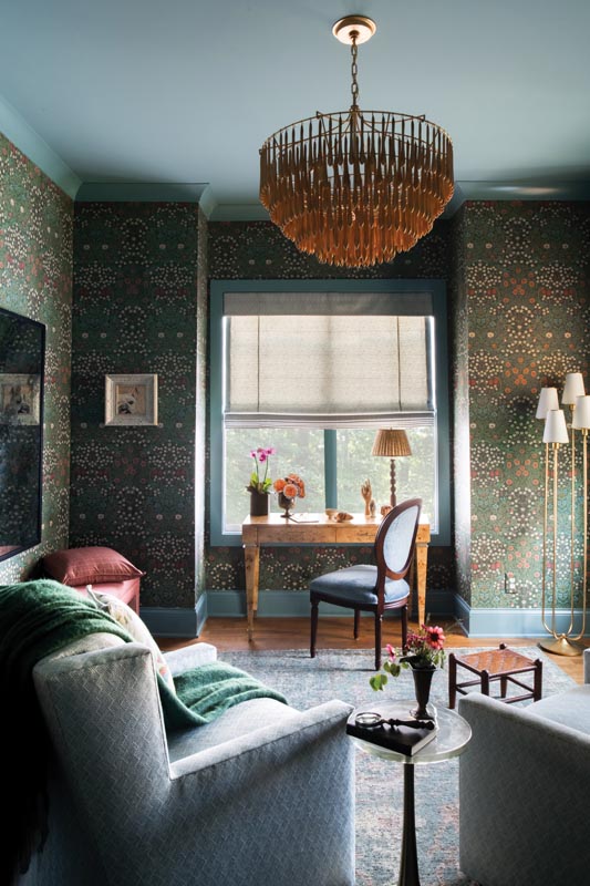 Each room has a different wallpaper pattern, but somehow they all flow together in a cohesive way. But once they decided which paper would be in each room, the rest of the design really came together, informing where they would go next with upholstery and window treatments, and rugs, especially in terms of scale.