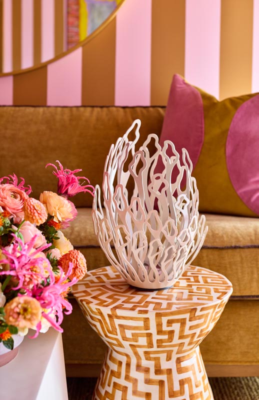 Alba, placed within designer Janie Molster’s interior space, offered a more intimate dialogue. Inspired by organic coral forms, its complex surface and three tonal hues found a perfect counterpoint within the room’s dramatic palette.