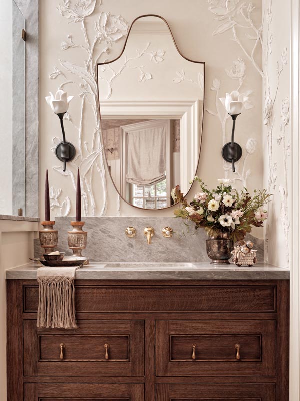 It also helps having local resources who care when you get in a pinch, as Parkes found out when the wallpaper they ordered was not going to arrive in time, three days before it was supposed to be installed. She called her dear friend Amanda Norman, who specializes in painting abstracts, florals, and portraits, and worked with her on a big pivot, creating a floral plaster chinoiserie in the powder room that ended up being a highlight of the entire house.