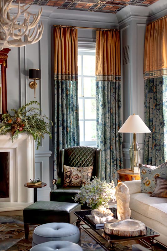 The ceiling was covered in Hartmann & Forbes blue textured grasscloth, which played into the blue tones used throughout the space, creating an Old World feel.