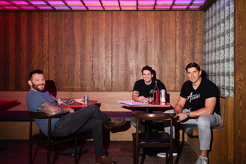 Colorful restaurant booth with neon pink and blue lighting - Nashville Interiors