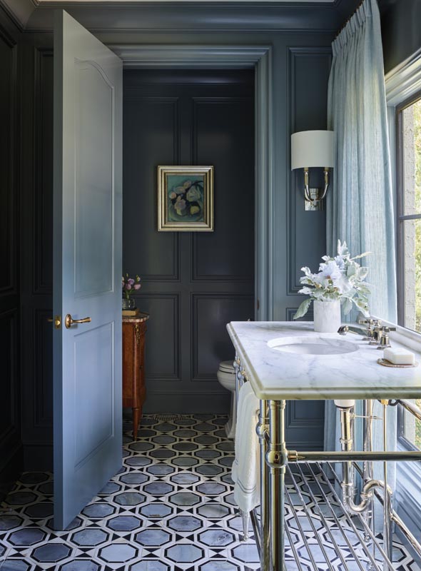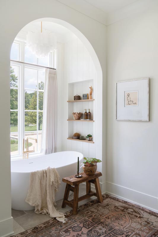 “We layered in materials, colors and textures one could find in today’s most elevated homes,” Stewart says. Think bouclé, velvet and linen textiles; a balanced mix of ebonized and white oak wood tones; Calacatta Viola; limewashed walls and brass accents.