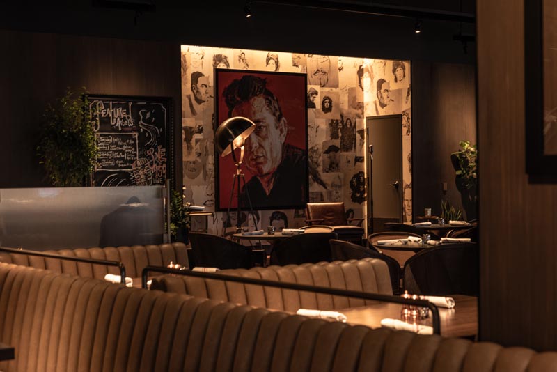 The stage wall is wrapped in a custom, hand-drawn wallpaper featuring caricatures of music icons like Amy Winehouse, David Bowie, Freddie Mercury, The Notorious B.I.G. and Tupac Shakur. Anchoring the interior is a larger-than-life painting of Johnny Cash.