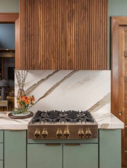 The trim work is all original to the house, and it was important to the homeowners that it remained — even if it meant carefully removing it to redo the kitchen and then putting it all back again. Sometimes it was used in a totally new way, like the doors that were originally a cased opening into the kitchen that were redone into a closet.